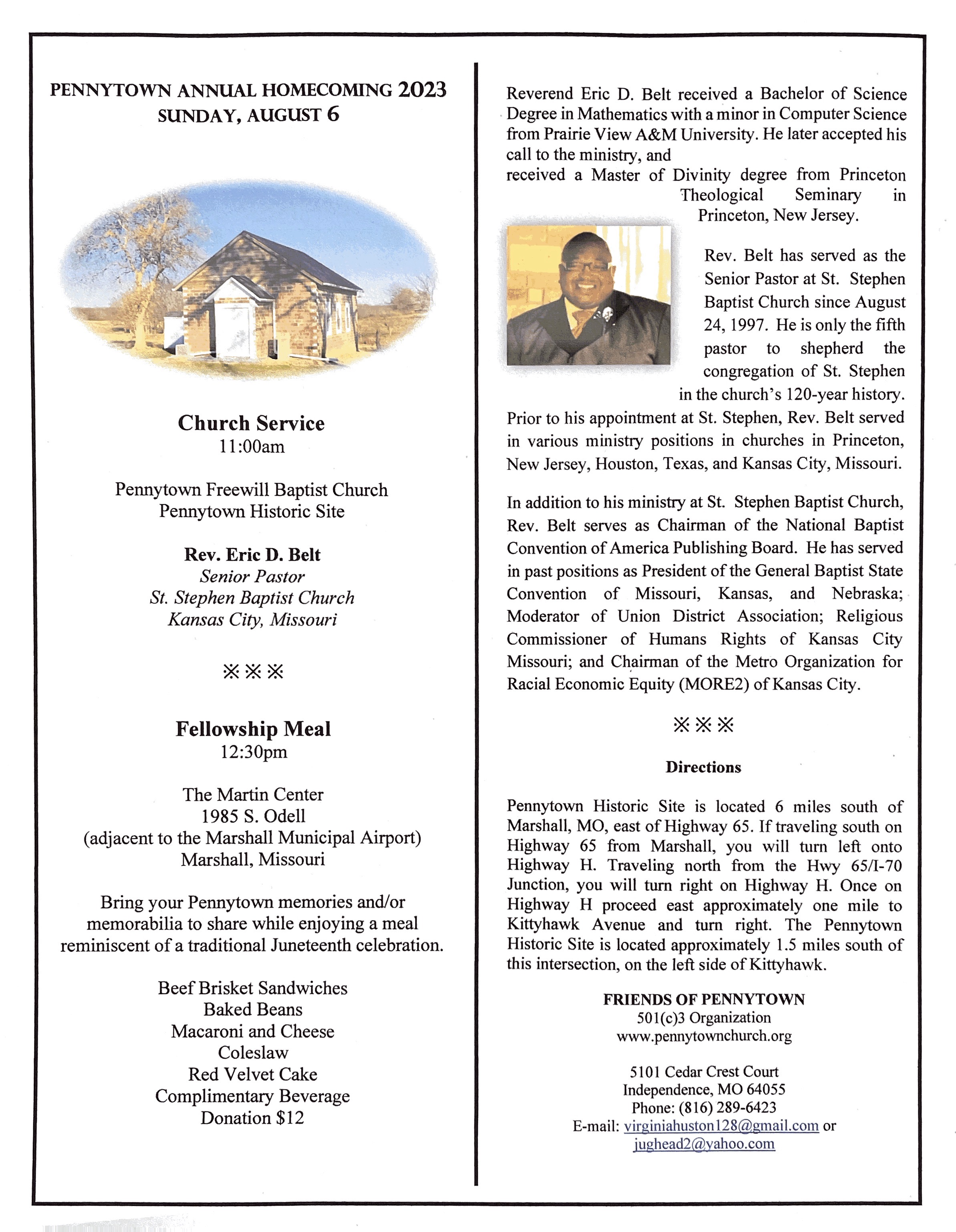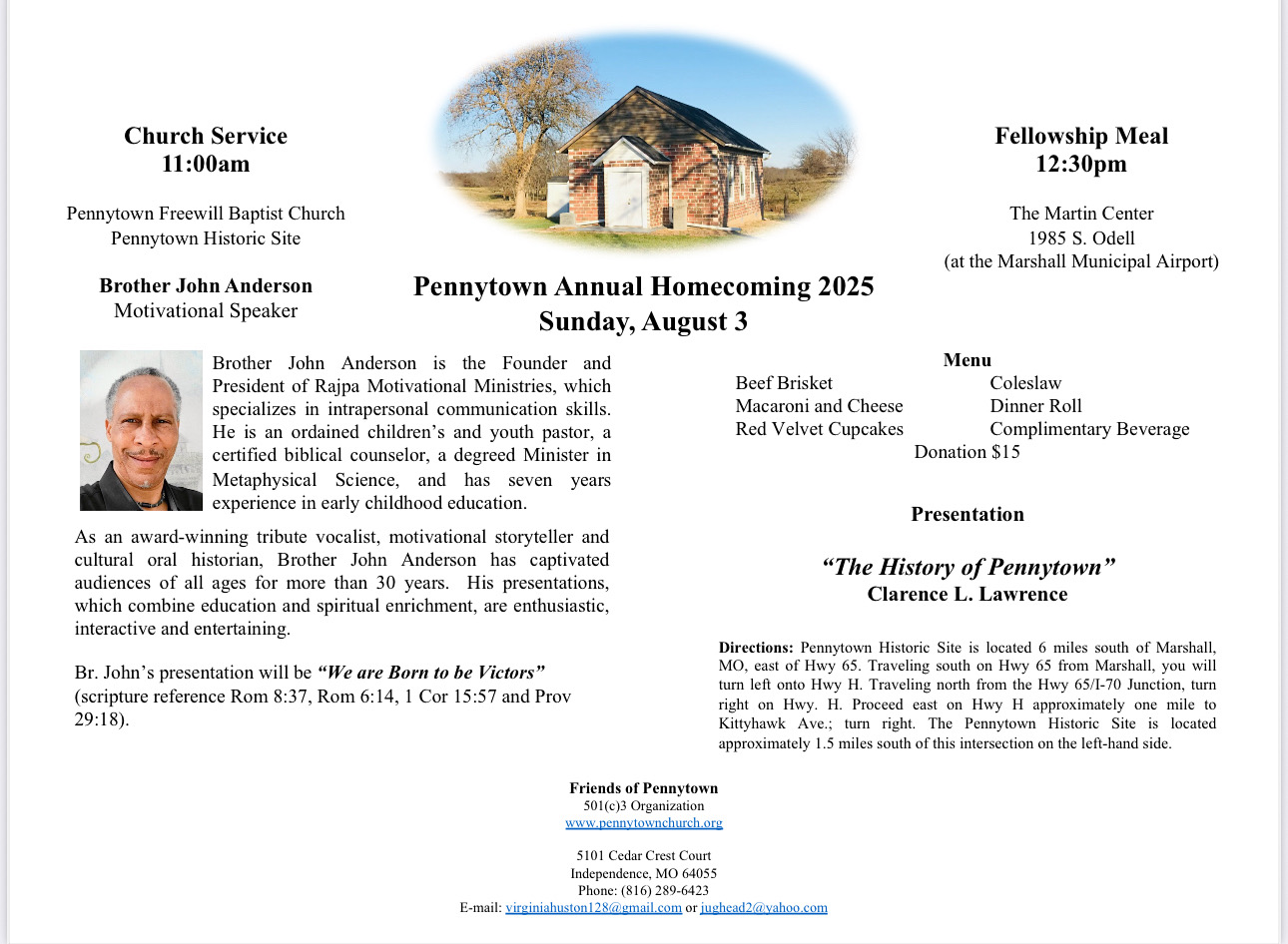 The celebration will begin at Pennytown Freewill Baptist Church at 11:00 am on Sunday, August 6th. Following music and services, we will move to the Martin Center in Marshall (1985 South Odell) for lunch and fellowship at 12:30 pm.